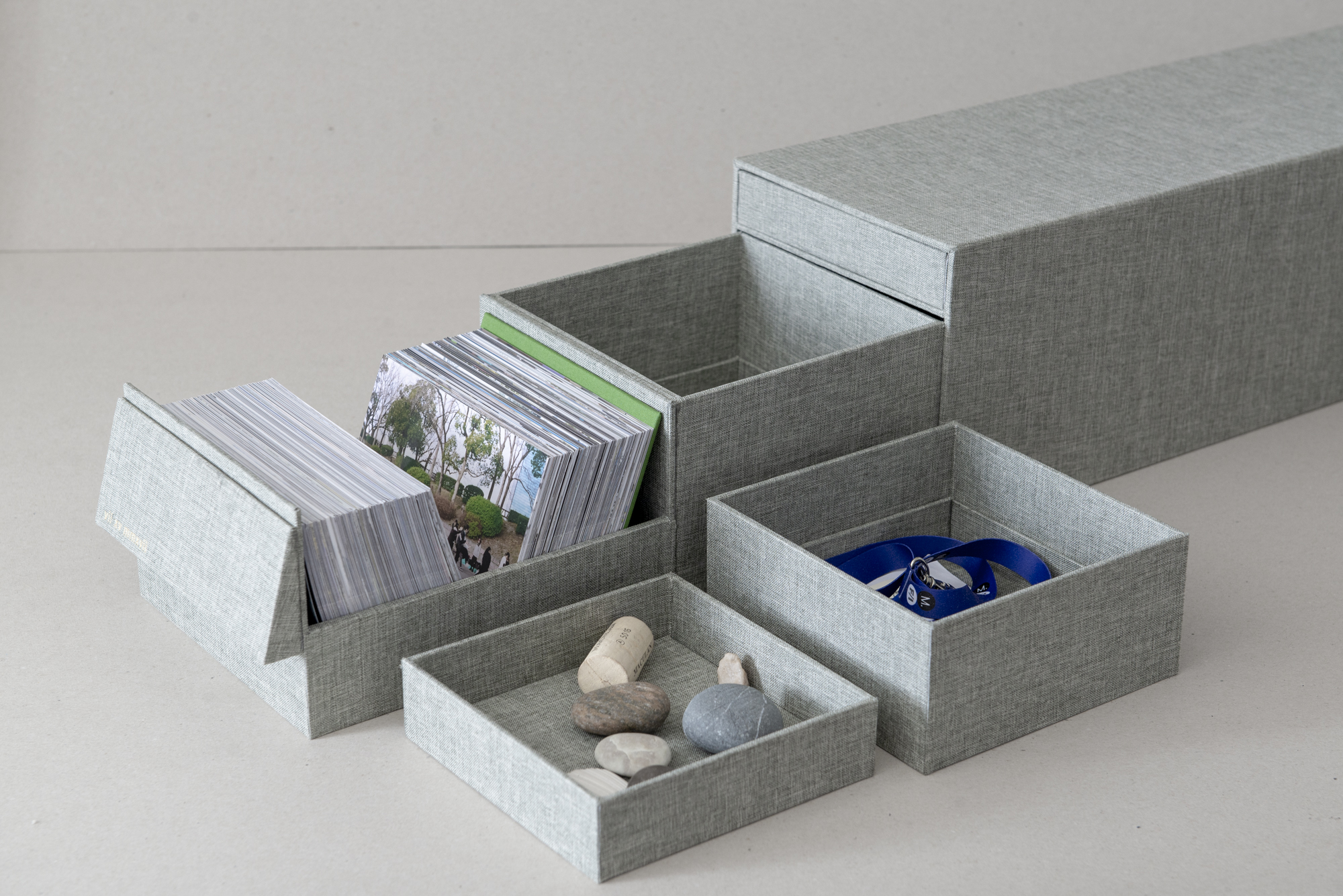 2 photo drawers, 1 long top box, 3 internal stacking boxes